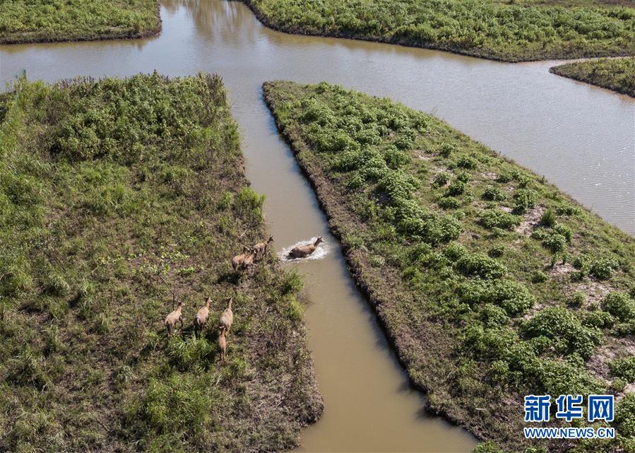 這是8月7日在東洞庭湖麋鹿和鳥類救治避難中心拍攝的麋鹿(無人機照片)。位于湖南省岳陽市的東洞庭湖麋鹿和鳥類救治避難中心成立于2016年9月,占地400余畝,中心自建成后就承擔起東洞庭湖區(qū)域全部麋鹿的救援、醫(yī)治、康復(fù)和喂養(yǎng)任務(wù)。目前該中心共有14只麋鹿正在接受救助。新華社記者李鑫攝