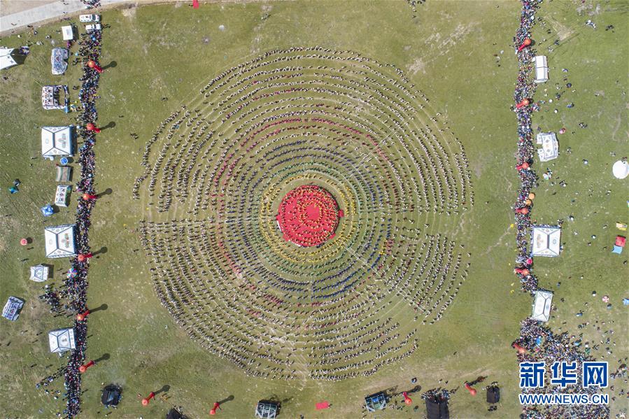 西藏首屆弦子舞展演現(xiàn)場(8月7日攝,無人機照片)。當日,西藏首屆弦子舞展演在昌都市芒康縣舉行。眾多演員同臺獻藝,表演國家級非物質(zhì)文化遺產(chǎn)弦子舞,吸引西藏各地的群眾前來觀看。新華社記者孫非攝