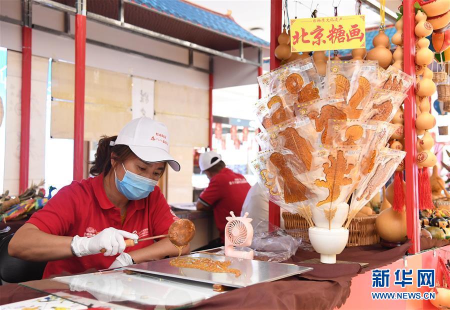 8月8日,在第十八屆中關(guān)村國(guó)際美食節(jié)美食美酒嘉年華文創(chuàng)非遺展示區(qū),工作人員制作糖畫。新華社記者 任超 攝
