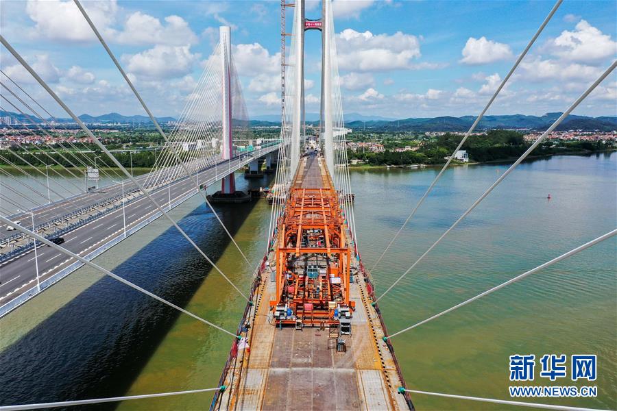 8月9日拍攝的廣州南沙港鐵路跨西江特大斜拉橋最后一塊鋼箱梁吊裝施工現(xiàn)場(無人機照片)。當(dāng)日,中鐵十一局承建的粵港澳大灣區(qū)基礎(chǔ)設(shè)施“硬聯(lián)通”重點工程——廣州南沙港鐵路跨西江特大斜拉橋完成最后一塊鋼箱梁吊裝作業(yè),大橋即將合龍。該橋位于廣東佛山市和江門市交界處,全長1117.5米。新華社記者劉大偉攝。