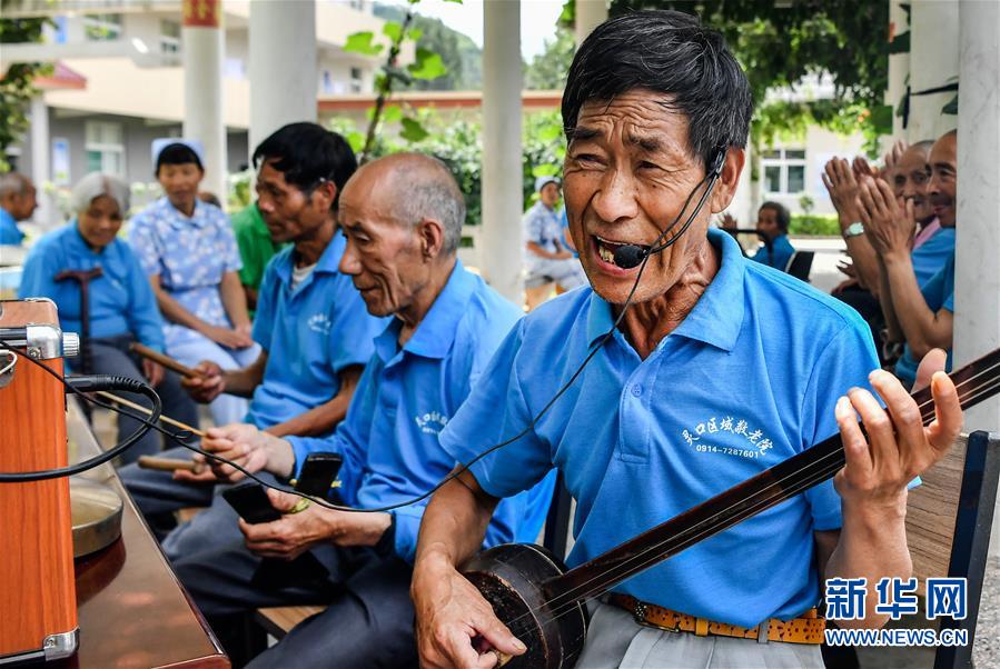 陜西商洛市洛南縣靈口區(qū)域敬老院的老人們在唱靜板書(7月28日攝)。據(jù)了解,陜西洛南縣目前共有9所敬老院,設置床位760張,對全縣愿意到敬老院的381名農(nóng)村特困人員實行集中供養(yǎng)政策。新華社記者劉瀟攝。