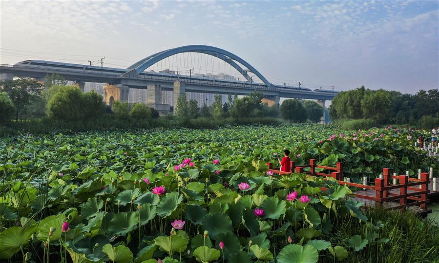 市民在唐山市豐南區(qū)人民公園欣賞荷花(7月25日攝,無人機(jī)照片)。近年來,河北省唐山市豐南區(qū)全力推動(dòng)“全域治水、清水潤城”工程,形成了以唐津運(yùn)河、人民公園生態(tài)廊道等以健身、休閑、旅游功能于一體的人水相親、城水相依的景觀環(huán)境,為綠色發(fā)展注入活力。新華社記者楊世堯攝。