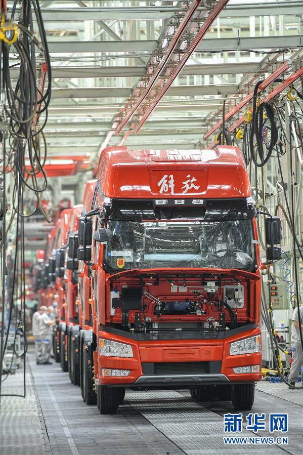 8月10日,在位于長(zhǎng)春市的一汽解放總裝車間,工人在裝配車輛。中國(guó)第一汽車集團(tuán)有限公司7月銷售整車32.2萬(wàn)輛,同比增長(zhǎng)23.2%,延續(xù)上半年的增長(zhǎng)態(tài)勢(shì)。新華社記者張楠攝。
