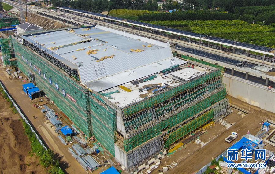 8月10日拍攝的建設(shè)中的京雄城際鐵路霸州北站(無人機(jī)照片)。京雄城際鐵路霸州北站站臺雨棚混凝土結(jié)構(gòu)施工日前全部完成,目前霸州北站已全面轉(zhuǎn)入裝飾裝修和機(jī)電安裝階段,預(yù)計(jì)2020年底投入使用。京雄城際鐵路是連接北京市區(qū)、大興機(jī)場和雄安新區(qū)的重要干線。建成后,將進(jìn)一步完善京津冀區(qū)域高速鐵路網(wǎng)結(jié)構(gòu),便利沿線群眾出行,對于推動京津冀協(xié)同發(fā)展和支撐建設(shè)雄安新區(qū)具有重要意義。新華社記者李曉果攝。