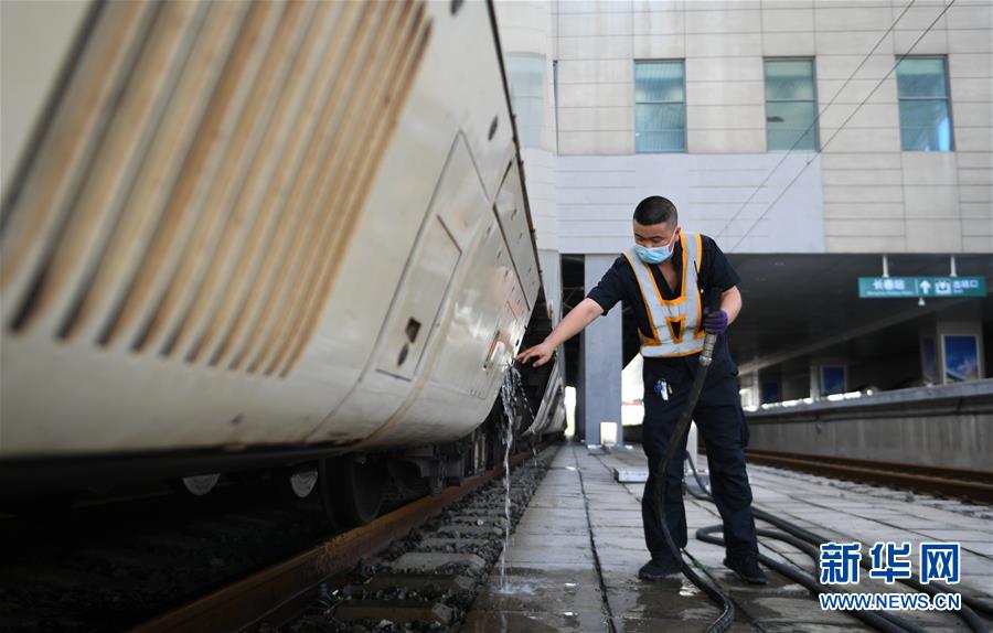 8月12日,長(zhǎng)春火車站客運(yùn)車間上水工常明結(jié)束上水工作后等候列車出站。新華社記者 林宏 攝