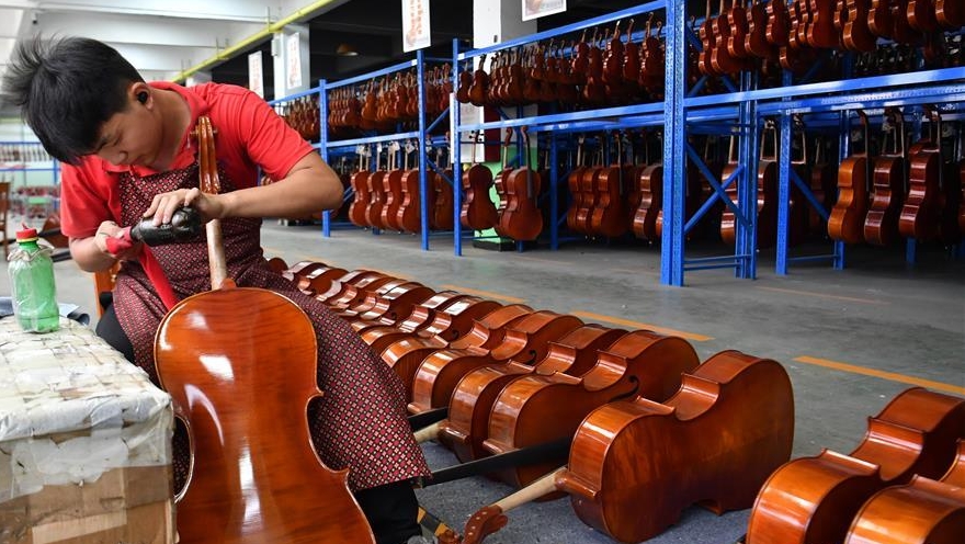 工人在河南駐馬店市確山縣提琴產(chǎn)業(yè)園提琴生產(chǎn)車間打磨琴頭。