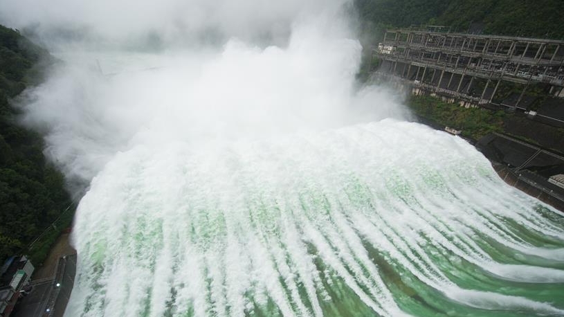 7月8日,新安江水庫(kù)開(kāi)啟9孔泄洪,新安江電廠工作人員在壩區(qū)巡視。