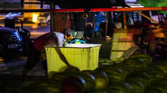 7月26日,在烏魯木齊新聯(lián)農(nóng)副產(chǎn)品綜合市場內(nèi),商販在整理剛進的新鮮蔬菜。