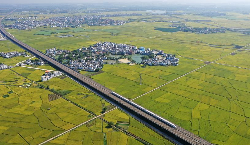 眼下,廣西賓陽縣古辣鎮(zhèn)大面積稻田進入收獲期,一列列南來北往的動車從稻田間飛馳而過,構(gòu)成一幅幅美麗的豐收圖畫。