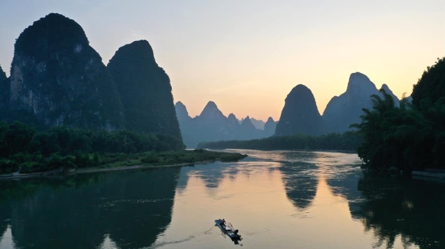 初夏時(shí)節(jié),在廣西桂林市陽朔縣興坪鎮(zhèn),藍(lán)天白云下,煙雨朦朧中,桂林山水盡顯秀美。