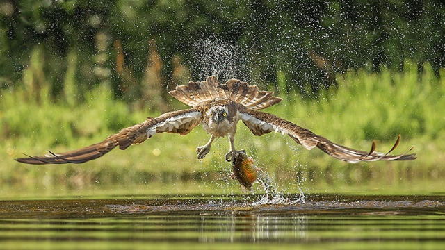 魚鷹快速俯沖而下,掠過水面,鷹爪隨即從水中成功抓起一條魚兒,濺起水花,整個(gè)過程精彩詮釋快準(zhǔn)狠。