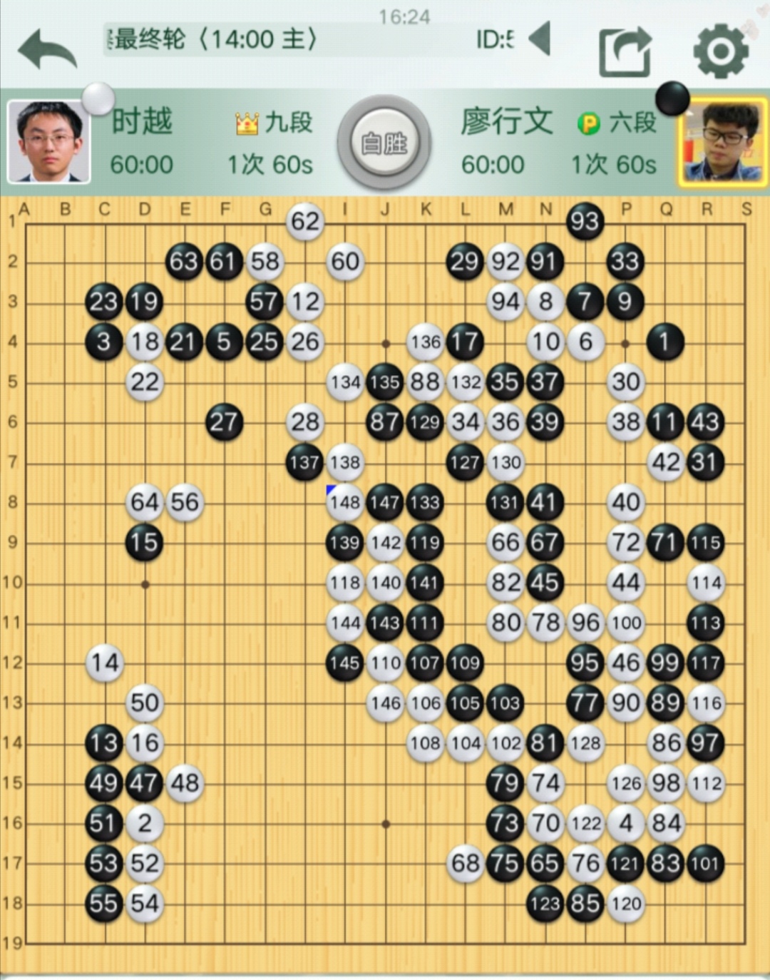 時(shí)越自評:序盤階段正常,黑棋率先在上邊打入挑起戰(zhàn)斗,中盤黑棋判斷失誤,之后形成轉(zhuǎn)換,白棋確立勝勢。