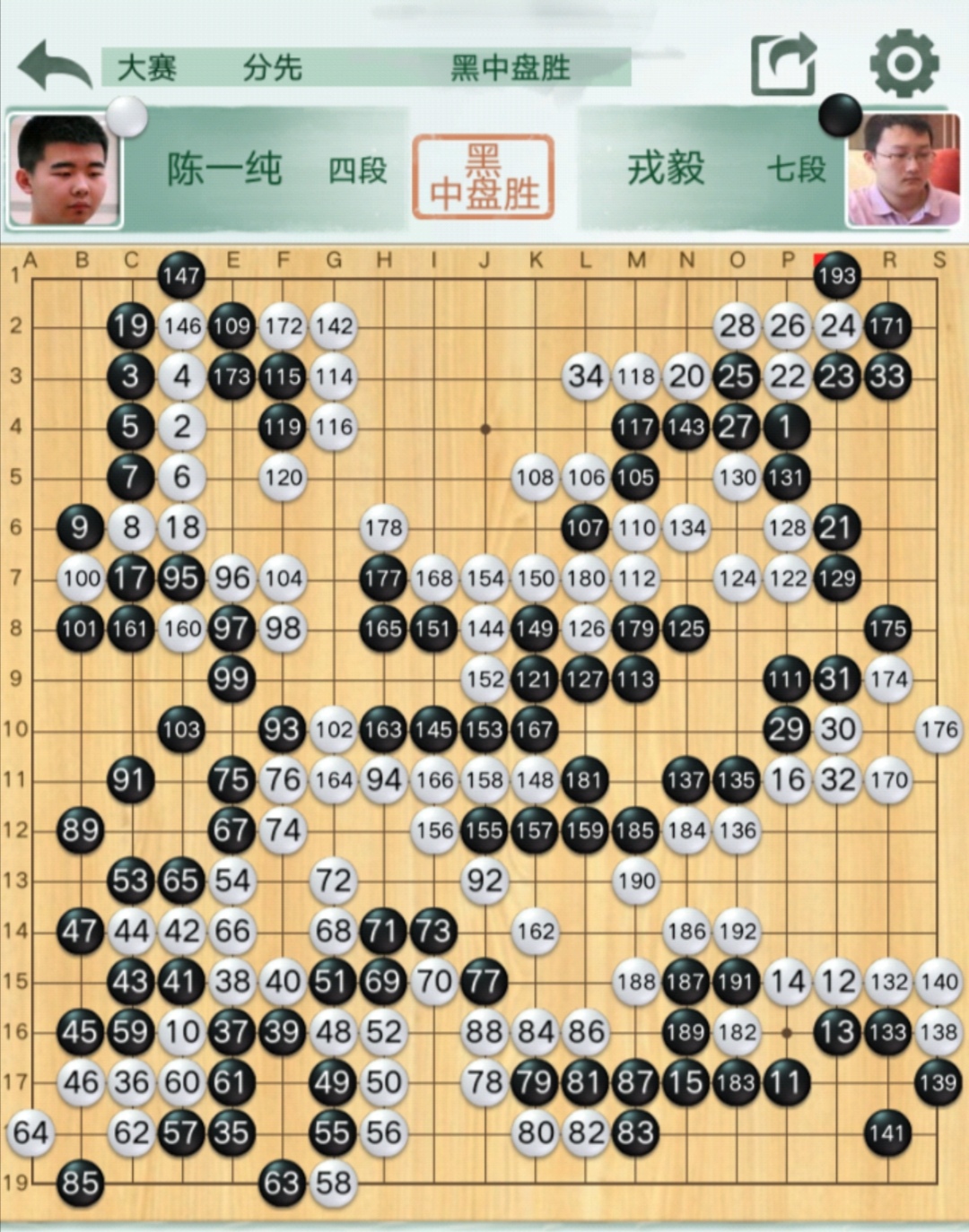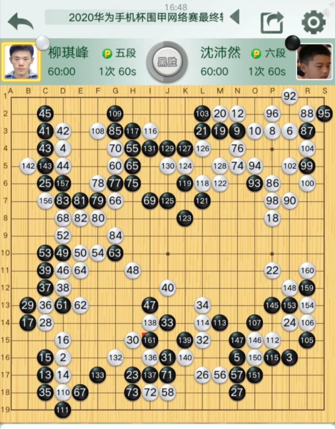 沈沛然自評:布局大致兩分,中盤白棋76斷失誤,應(yīng)當(dāng)左上角斷補(bǔ),那樣局面尚早,實(shí)戰(zhàn)形成轉(zhuǎn)換黑棋大賺,勝局已定。