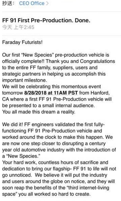 智通財經(jīng)APP獲悉,當?shù)貢r間27日凌晨,賈躍亭創(chuàng)辦的美國電動汽車品牌FF(Faraday Future)的員工收到來自CEO辦公室郵件,稱FF91的第一輛試產(chǎn)車已經(jīng)完成。