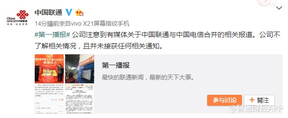 智通財經APP獲悉,中國聯(lián)通在微博發(fā)布聲明稱,公司注意到有媒體關于中國聯(lián)通與中國電信合并的相關報道,不了解相關情況,且并未接獲任何相關通知。