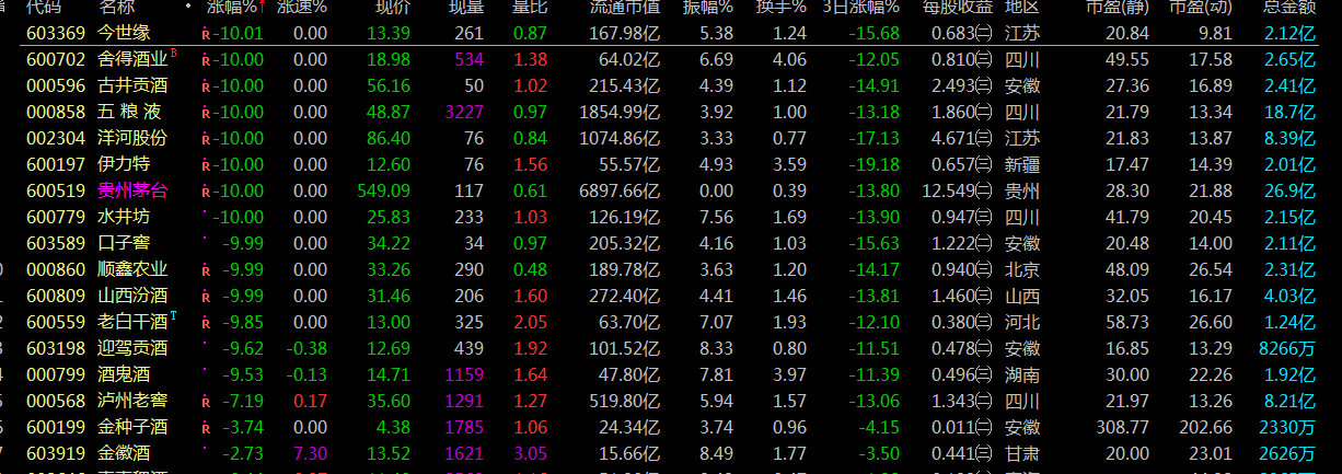 云財(cái)經(jīng)訊,10月29日早間,白酒股集體暴跌,截至發(fā)稿,貴州茅臺(tái)(600519)、洋河股份(002304)、口子窖(603589)、順鑫農(nóng)業(yè)(000860)跌停、五糧液(000858)逼近跌停。據(jù)統(tǒng)計(jì),近5個(gè)交易日,A股白酒板塊總市值縮水超3400億元。消息面上,今年貴州茅臺(tái)(600519)前三季度的業(yè)績?cè)鏊儆兴啪?。公司第三季度的凈利?shí)際同比增長率僅為2.71%。