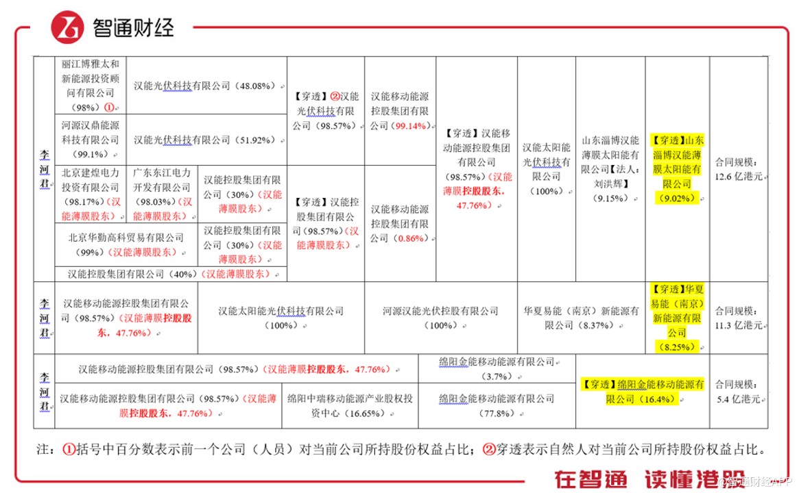 漢能移動又通過持股其它公司,間接持有山東淄博漢能薄膜太陽能有限公司(淄博漢能)9.15%股權(quán),穿透股權(quán)發(fā)現(xiàn)李河君持有淄博漢能9.02%股權(quán)。