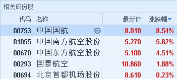 智通財(cái)經(jīng)APP獲悉,受益于國(guó)際原油價(jià)格下挫,航空股全線大漲。截至9時(shí)20分,中國(guó)國(guó)航(00753)漲8.54%,報(bào)價(jià)8.01港元,南方航空(01055)漲5.82%,報(bào)5.27港元,東方航空(00670)漲4.51%,報(bào)5.1港元,國(guó)泰航空(00293)漲1.88%,首都機(jī)場(chǎng)(00694)漲0.23%。