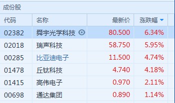 受益于G20結(jié)果超預(yù)期,早盤手機產(chǎn)業(yè)鏈全線反彈。舜宇光學(xué)(02382)漲6.34%,報80.5港元,瑞聲科技(02018)漲5.95%,報58.75港元,比亞迪電子(00285)漲4.74%,報11.5港元。