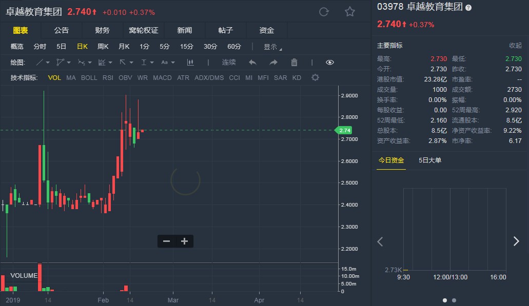 截至發(fā)稿,卓越教育(03978)升0.37%,報2.740港元。(劉大洋)