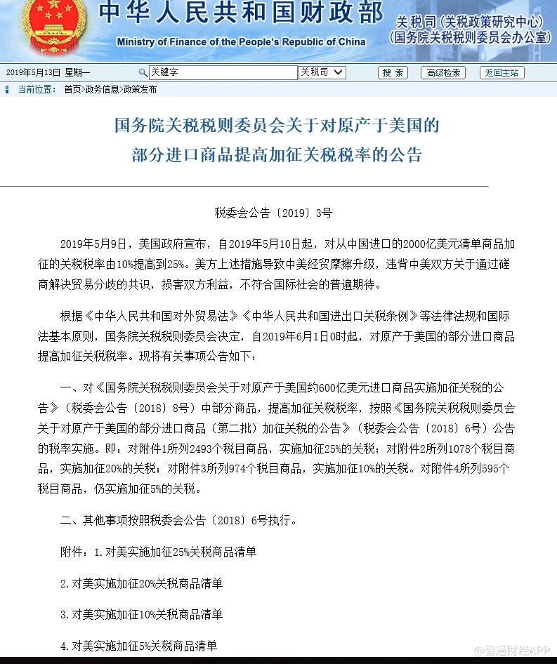智通財(cái)經(jīng)APP獲悉,據(jù)財(cái)政部官網(wǎng)消息,2019年5月9日,美國政府宣布,自2019年5月10日起,對(duì)從中國進(jìn)口的2000億美元清單商品加征的關(guān)稅稅率由10%提高到25%。美方上述措施導(dǎo)致中美經(jīng)貿(mào)摩擦升級(jí),違背中美雙方關(guān)于通過磋商解決貿(mào)易分歧的共識(shí),損害雙方利益,不符合國際社會(huì)的普遍期待。