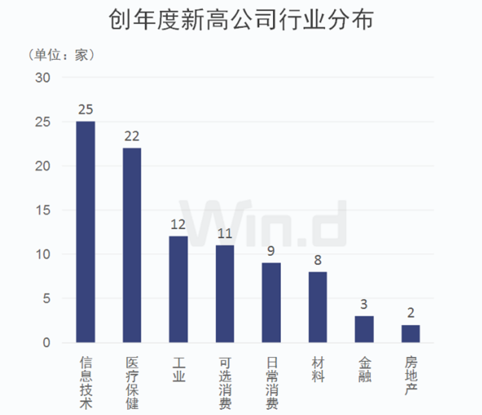 Wind統(tǒng)計顯示,有92家公司近3日最高股價創(chuàng)今年以來新高。從相關(guān)公司行業(yè)分布來看,信息技術(shù)類最多,有25家;醫(yī)療保健行業(yè)緊隨其后,有22家,工業(yè)、可選消費均有超過10家公司??梢?,科技和生物醫(yī)藥類公司成為牛股聚集地。