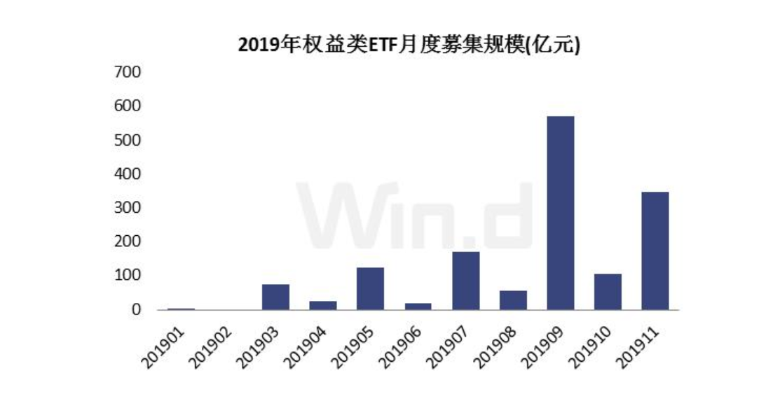 月度數(shù)據(jù)來看,今年9月權(quán)益類ETF募集規(guī)模最大,達571.98億元;其次就是11月,目前11月尚未過半,權(quán)益類ETF募集規(guī)模已達348.84億元。