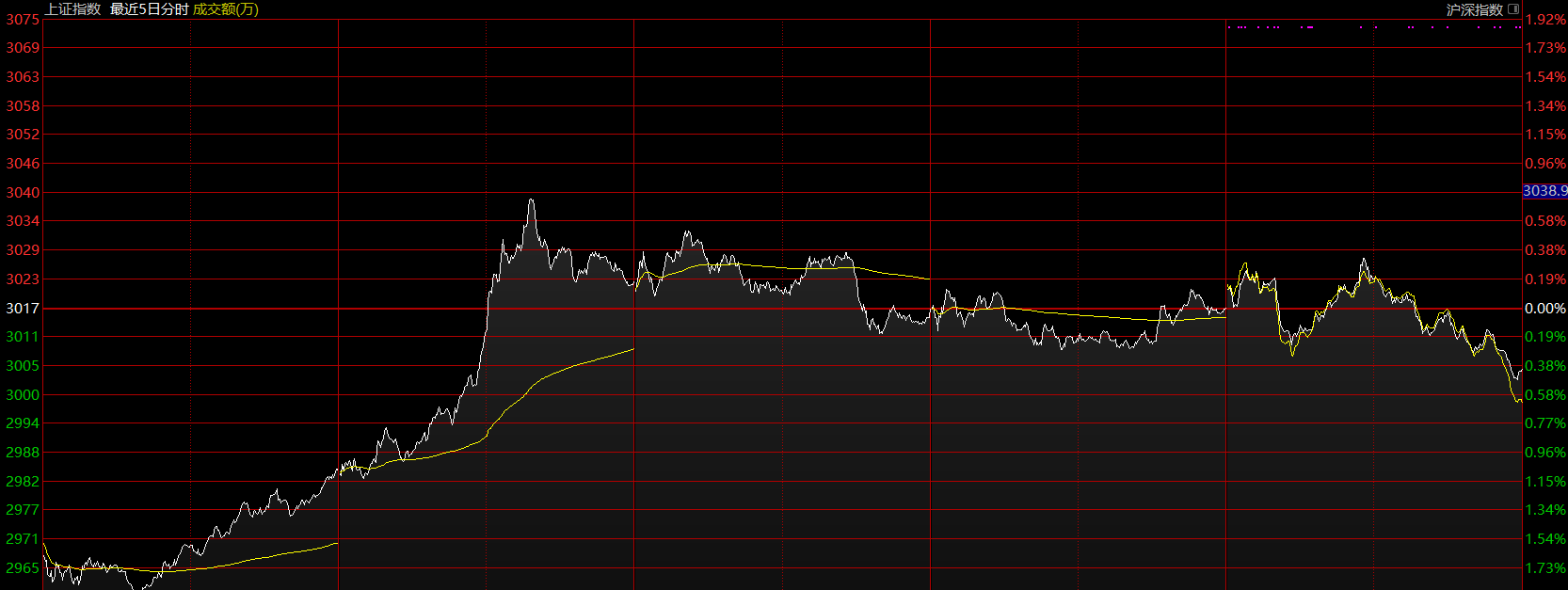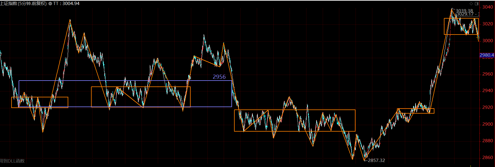 目前分析只需集中于這個(gè)五分鐘的上漲趨勢即可,上周如期做出了五分鐘上漲趨勢第二個(gè)中樞的雛形。前面幾天表現(xiàn)其實(shí)蠻超預(yù)期的,特別是科技股的逼空,A股似乎許久未見了。核心問題出在周五,周五有兩個(gè)點(diǎn)顯示出當(dāng)下市場的外強(qiáng)中干,第一個(gè)在于周五早盤南京證券反包漲停時(shí),市場資金的失衡,明顯看出科技股與券商股兩臺“抽水機(jī)”從前幾天的互相配合變成了互相傷害;這一段跳水直接將圖形破壞,強(qiáng)度大的新高背馳可以說已經(jīng)沒有了,那下午上拉無力后的跳水也就在情理之中。