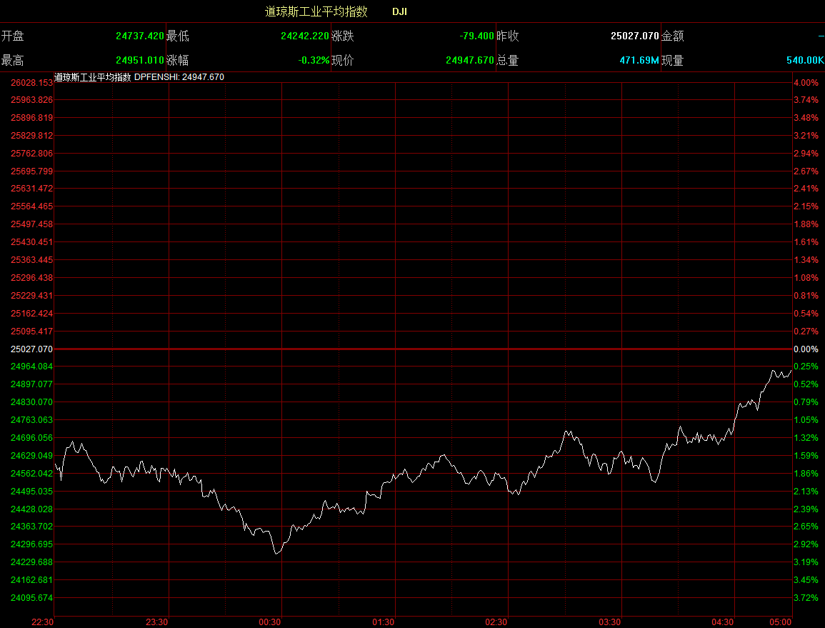 美國股市收復早段跌勢,三大指數收市窄幅上落。道指低開289點后愈跌愈急,至中段最多跌784點,其后跌勢大幅回順,全日收報24947點,跌79點。