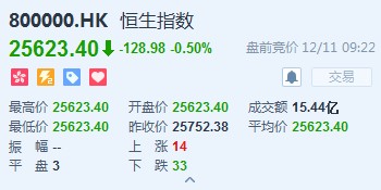 恒生指數開盤跌0.5%,報25623.4點。國企指數跌0.61%,報10210.31點。紅籌指數跌0.15%,報4203.78點。大市盤前成交15.44億港元。