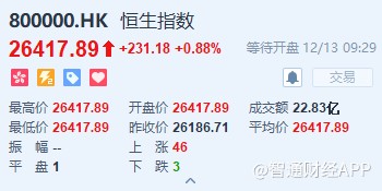 恒生指數開盤漲0.88%,報26417.891點。國企指數漲0.83%,報10504.04點。紅籌指數漲0.95%,報4347.83點。大市盤前成交22.83億港元。