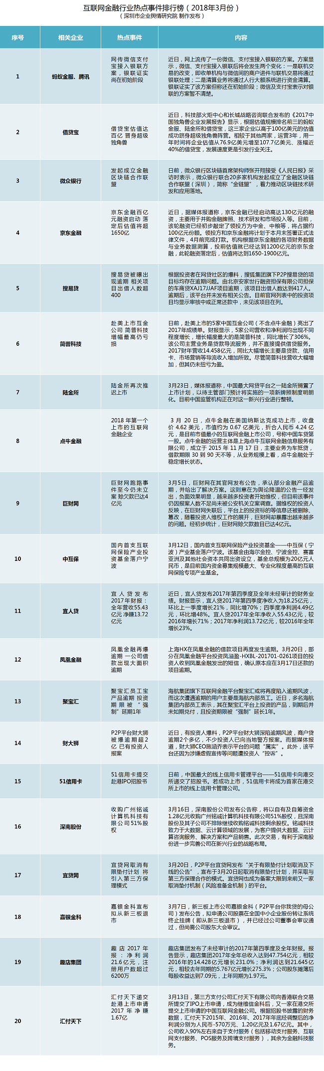 互聯(lián)網(wǎng)金融行業(yè)熱點(diǎn)事件排行榜榜單說明:本榜單主要通過計(jì)算機(jī)系統(tǒng)對輿情數(shù)據(jù)的自動(dòng)采集、整理和分析,結(jié)合輿情分析師的篩選和研判,對2018年3月1日至3月31日這一時(shí)段內(nèi)互聯(lián)網(wǎng)金融領(lǐng)域的熱點(diǎn)輿情事件(主要是涉企輿情)作出綜合評估而得。主要評估指標(biāo)包含新聞報(bào)道指數(shù)、微博擴(kuò)散指數(shù)、論壇參與指數(shù)和境外炒作指數(shù),在上述指標(biāo)基礎(chǔ)上,根據(jù)相關(guān)算法得出事件綜合影響力指數(shù),按照指數(shù)大小進(jìn)行排序。