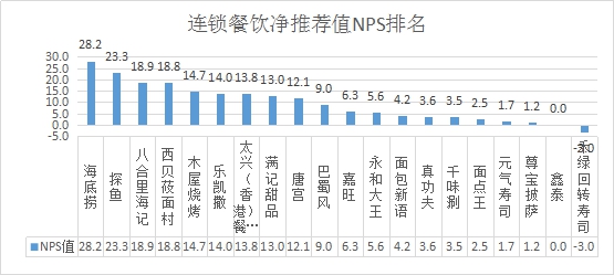 在本次調(diào)研中,20個連鎖餐飲品牌包括三類:中式正餐(海底撈、探魚、八合里海記、西貝筱面村、木屋燒烤、太興(香港)餐廳、唐宮、巴蜀風、千味涮)、中式快餐(嘉旺、永和大王、真功夫、面點王)、特色餐飲(樂凱撒、滿記甜品、面包新語、元氣壽司、尊寶披薩、鑫泰、禾綠回轉壽司)。整體的平均凈推薦值為9.4分。排名第一的是海底撈,凈推薦值為28.2分;其次是探魚,凈推薦值為23.3分;第三名是八合里海記,凈推薦值為18.9分。