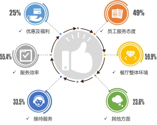 本次調(diào)查從餐廳整體環(huán)境、服務效率、員工服務態(tài)度、接待服務、優(yōu)惠及福利及其他方面等六個維度展開,其中餐廳整體環(huán)境與服務效率是消費者最主要推薦的原因,餐廳整體環(huán)境推薦比例最高,為55.9%。