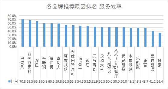 排名第一的是巴蜀風,服務效率推薦率為70.8%;其次是西貝莜面村,推薦率為68.5%;第三名是探魚,推薦率為66.1%。