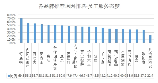 員工服務態(tài)度推薦率排名:排名前三的是海底撈、西貝莜面村、真功夫;