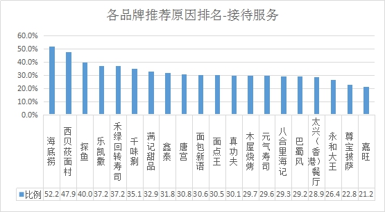 排名第一的是海底撈,接待服務推薦率為52.2%;其次是西貝莜面村,推薦率為47.9%;第三名是探魚,推薦率為40.0% 。