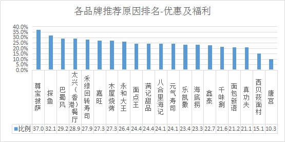 排名第一的是尊寶披薩,優(yōu)惠及福利推薦率為37.0%;其次是探魚,推薦率為32.1%;第三名是巴蜀風,推薦率為29.2%。