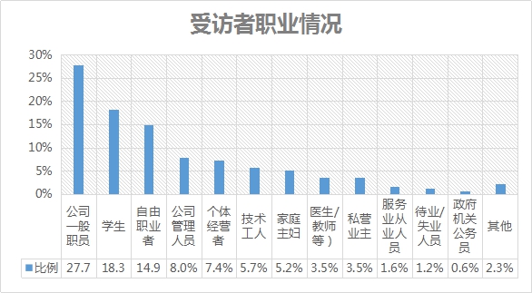 本次調(diào)研中,公司一般職員的比例最高,為27.7%,其次是學生,占比為18.3%。53.9%的受訪者其個人月收入超過5000元。
