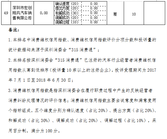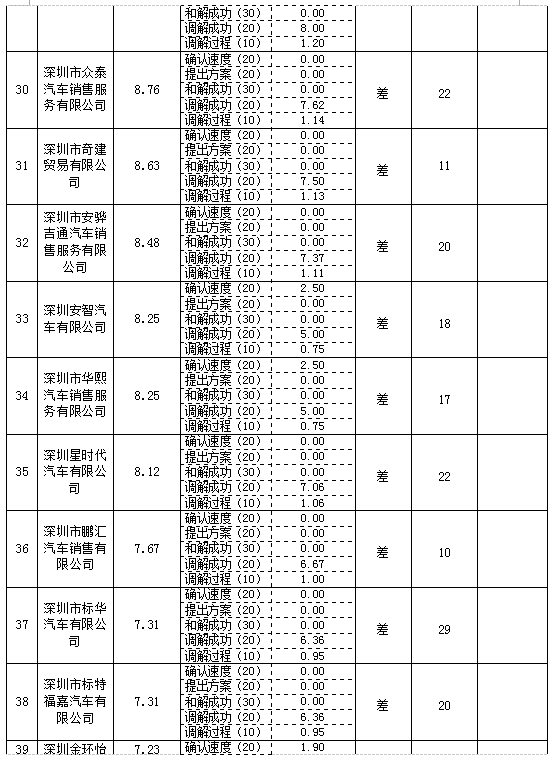 在細(xì)分指標(biāo)方面,深圳市標(biāo)域汽車有限公司、深圳標(biāo)特汽車(集團(tuán))有限公司和深圳市宏創(chuàng)陸風(fēng)汽車銷售有限公司等27家企業(yè)處理投訴不及時(shí),未積極與消費(fèi)者先行和解,導(dǎo)致其企業(yè)“確認(rèn)速度”、“提出方案”和“和解成功”三項(xiàng)分項(xiàng)指標(biāo)的分?jǐn)?shù)皆為0,嚴(yán)重影響了企業(yè)的消費(fèi)維權(quán)信用指數(shù)和信用等級(jí)。深圳市仁孚特力汽車服務(wù)有限公司、深圳市安進(jìn)汽車貿(mào)易有限公司和深圳市大興寶譽(yù)汽車銷售服務(wù)有限公司在由消委會(huì)工作人員評(píng)分的“調(diào)解過程”分項(xiàng)指標(biāo)分?jǐn)?shù)為負(fù)分,3家企業(yè)存在不配合調(diào)解甚至拒絕調(diào)解的情況,解決消費(fèi)糾紛的誠意度較差;另外,深圳市宏創(chuàng)陸風(fēng)汽車銷售有限公司的消費(fèi)維權(quán)信用指數(shù)為0,誠意度和滿意度為0,10宗消費(fèi)投訴皆未處理成功,排名最后。