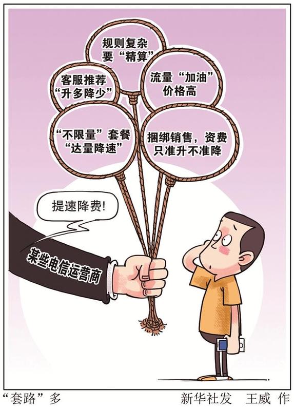 套路五:捆綁銷售,資費只準升不準降。許多消費者在辦理手機套餐時,運營商會贈送寬帶服務,二者資費不能單獨改動。深圳王女士去年辦理了某運營商的“136元贈送寬帶”的電信套餐,但套餐內(nèi)流量只有1GB,且不能更換成其他流量資費優(yōu)惠的套餐;如果超流量就必須支付30元1GB的“流量包”。王女士每月實際通訊費超過170元。
