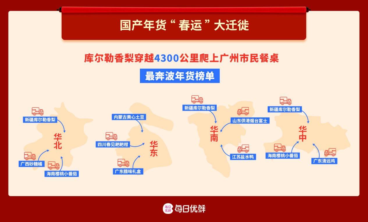 在“最奔波年貨榜單”里,每日優(yōu)鮮為各地的年貨特產(chǎn)都計(jì)算了“春運(yùn)”路程。粵式臘味禮盒和廣東清遠(yuǎn)雞就分別成了華東和華南最有人氣的特色年貨之一。