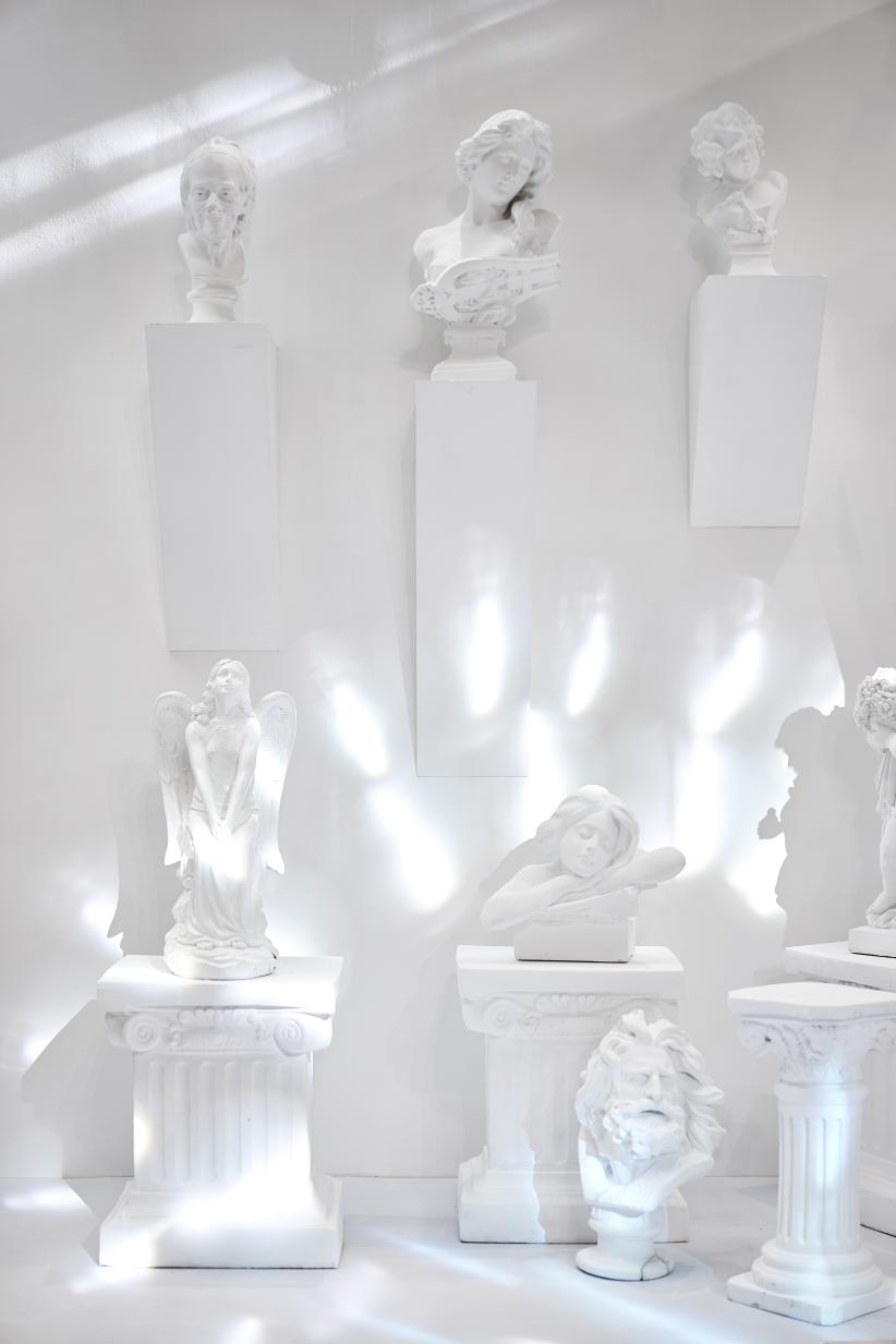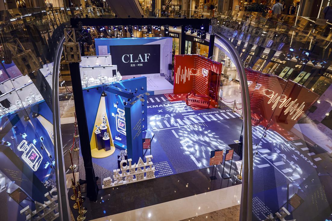 愛之全體驗靜態(tài)藝術(shù)展分為四個區(qū)域,分別對應 C-L-A-F(克拉時刻的英文),C對應白色區(qū)域,代表 C lassic(經(jīng)典 ),在“C lassic”的區(qū)域中,洛杉磯郡藝術(shù)博物館標志地標-燈柱( Urban Light)與文藝復興的石膏像相結(jié)合,打造一片純凈又不失時尚的打卡區(qū)域。L對應紅色區(qū)域,代表Love(愛),設計了以“心電感應”的一堵墻面,描繪遇到“愛情”的場景,從“正?!钡男碾妶D到遇見“愛”的怦怦心跳,純紅色的背景是打卡拍照的最佳地點。 A對應藍色區(qū)域,代表Aftertaste(回味),整體背景運用國際克萊因藍,形成撞色的沖擊感。利用香水瓶,打造了一個藍色的“氣味收藏室”。F對應黑色區(qū)域,代表Forever(永恒),運用霓虹燈管打造神秘時尚的氛圍,就像鉆石一樣在黑暗中閃爍,黑色背景成為許多人打卡點,仿佛電影橋段般的文字設計,非常適合還原電影場景。