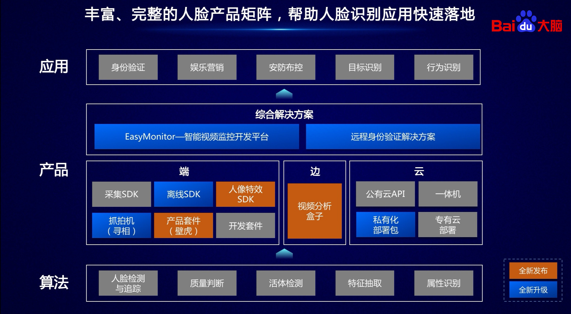 而在此次發(fā)布會(huì)上,百度大腦全新發(fā)布3款產(chǎn)品、5項(xiàng)升級(jí)。新產(chǎn)品包括:軟硬一體、快速上手開(kāi)發(fā),配備外殼即可落地的人臉識(shí)別產(chǎn)品套件(壁虎);人像處理 SDK;小型化邊緣計(jì)算終端——人臉視頻分析盒子。在原有的人臉識(shí)別產(chǎn)品、方案的基礎(chǔ)上,全新升級(jí)的5項(xiàng)內(nèi)容,包括遠(yuǎn)程身份驗(yàn)證方案;EasyMonitor—智能視頻監(jiān)控開(kāi)發(fā)平臺(tái);尋相人臉抓拍機(jī);具備3D識(shí)別算法、算法泛化增強(qiáng)、模塊化計(jì)費(fèi)等功能的人臉識(shí)別離線SDK;私有化部署包。百度大腦希望用更豐富完整的人臉產(chǎn)品矩陣,為廣大開(kāi)發(fā)者、企業(yè)等用戶提供更全面、更安全、更完善的產(chǎn)品服務(wù)。