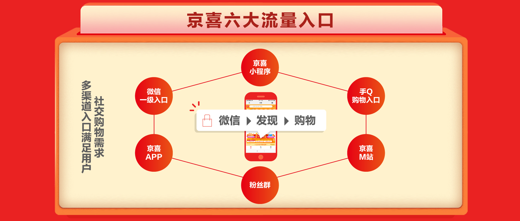 京喜是京東以全面升級(jí)的拼購業(yè)務(wù)為核心,以微信一級(jí)入口為主要載體,基于六大移動(dòng)端渠道打造的全域社交電商平臺(tái)。