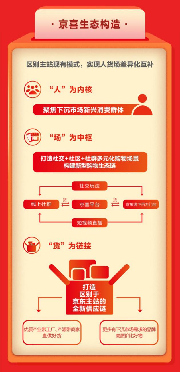 今年,京東打造了區(qū)別于京東主站現(xiàn)有場(chǎng)景和模式的全新平臺(tái)——京喜,于9月19日正式上線。京喜聚焦于下沉新興市場(chǎng)消費(fèi)人群,通過高質(zhì)價(jià)比好貨及豐富的社交玩法,與京東主站實(shí)現(xiàn)了“人”、“貨”、“場(chǎng)”的差異化互補(bǔ)。