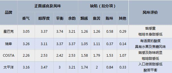 而20位咖啡達(dá)人對(duì)4款美式咖啡的整體風(fēng)味評(píng)價(jià)也不盡相同:瑞幸有適度的酸度,具有水果及焦糖風(fēng)味,接受程度最高;星巴克煙感重,咖啡本身甜感低;COSTA煙感及陳味明顯,酸酐較強(qiáng),咖啡甜感低;太平洋入口微苦甜感低,酸苦較平衡。