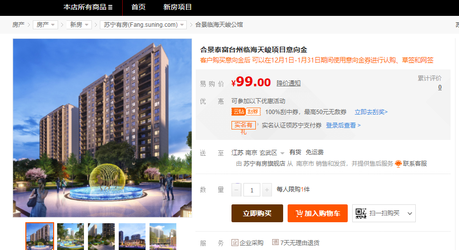 購房者在蘇寧易購首頁進入“新房特惠”專題,選擇意向房源,購買99元意向金之后,可優(yōu)先購買雙十二特價房。