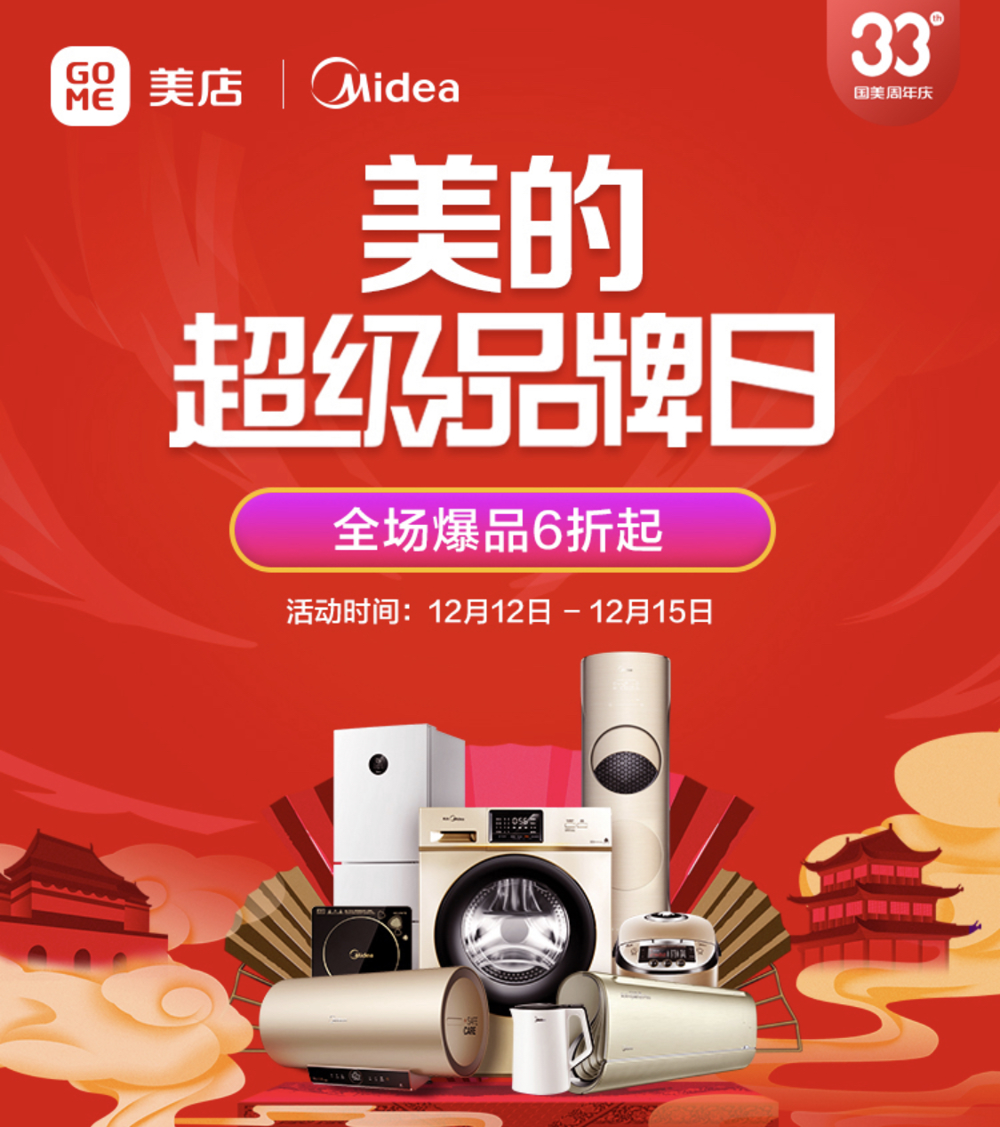 12月12日-15日,33周年生日之際,國美與海爾再度攜手,國美美店帶來海爾超級(jí)品牌日活動(dòng),涵蓋了海爾冰箱、洗衣機(jī)、空調(diào)、電視、廚房衛(wèi)浴等多個(gè)品類豐富產(chǎn)品,多重優(yōu)惠福利、六大承諾保障、延保清洗服務(wù)。