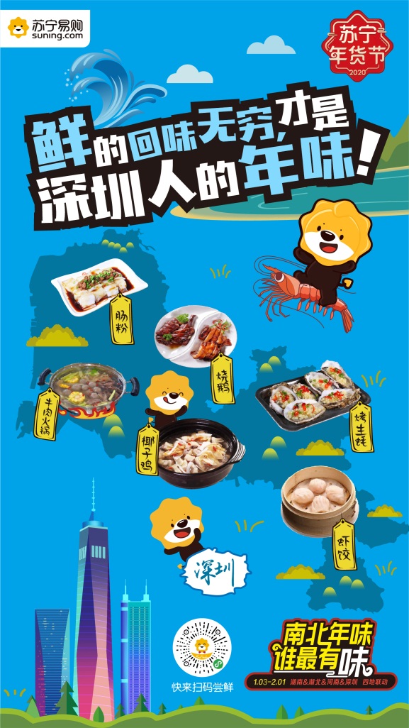 說起年味必提到年夜飯,中國地大物博每個城市的年夜飯各有特色,究竟哪個城市的年味最濃,各家眾說紛紜。為此華南、華中、華北具有代表性的四個城市紛紛站出來為各家城市的年味代言,深圳、武漢、長沙、鄭州四城分別從年味、年俗、年貨、方言等方方面面為消費(fèi)者獻(xiàn)上了一頓年味大餐。那些記憶里存在的各色過年儀式,味覺里保留的故鄉(xiāng)味道,腦海里熟悉的地方鄉(xiāng)音,在這場年味比拼里一一重現(xiàn),喚醒了大家對于過年的期許,引發(fā)社交平臺上大家對于年味的分享。對于深圳這個移民大城往往被貼上沒有特色年貨的標(biāo)簽,其實(shí)不然,作為嶺南文化重要傳承地的深圳擁有眾多特色年俗。并且隨著越來越多的人選擇春節(jié)留在深圳過年,深圳的年味也越來越濃,因此深圳蘇寧在本次南北年味的話題中,不斷深挖深圳年味,打造了一張?zhí)厣某鞘写汗?jié)名片。